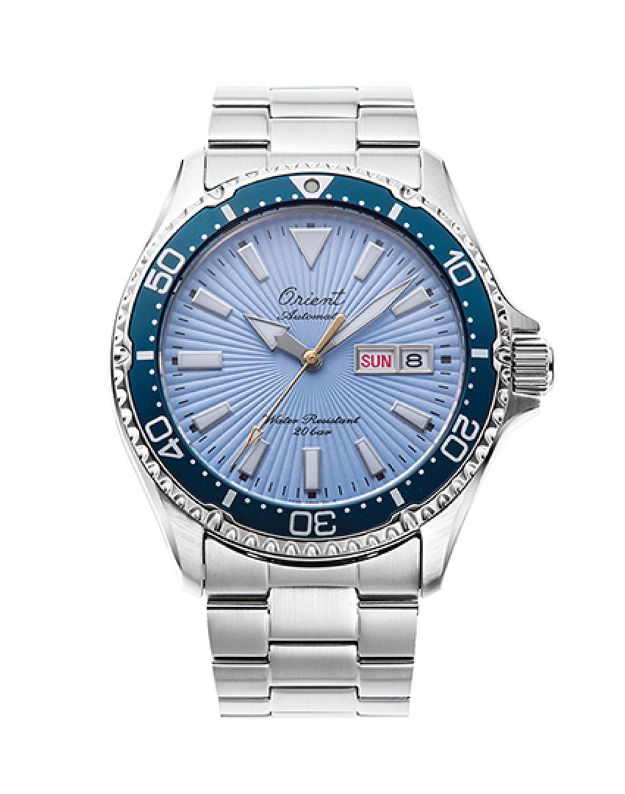 This model elicits the feeling of sunny days with endless blue skies and a gentle sea breeze. It features a sky-blue dial that stands out in active settings, with a sunburst stamped pattern, sunlight-inspired second hand, and a vintage Orient cursive logo from the 1950s. These features all enhance the character of this timepiece. The case with a screw case-back and screw down crown provide water resistance to 20 bar, and a cursive inscription "Orient Since 1950 - 75th Anniversary" and individual serial numbers are engraved on the case-back.
