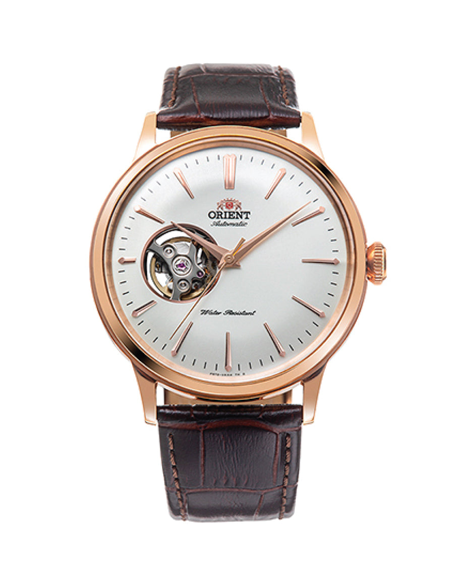 Presenting a stunning combination of classic allure and superior watch making, this new ORIENT 40.5mm mechanical watch showcases several captivating features. The watch’s rounded boxed glass elegantly frames the curved silver bombe dial, set in a beautiful stainless steel rose gold case. Enhancing the striking aesthetic is an attractive see-through case back. Additional distinguished features include a semi-skeleton view, an appealing all-occasion band, stylish rose gold hands, and a hand-wound crown with automatic self-winding functionality. The refined RA-AG00001S supports water resistance of 30 meters.